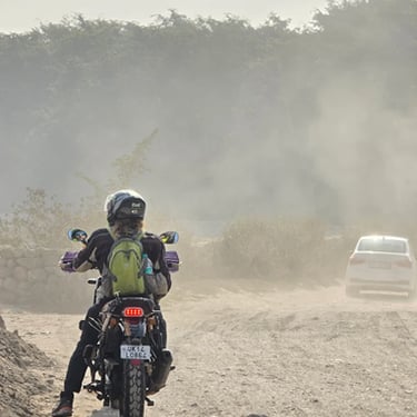 From the Chilla forest track, the journey becomes more adventurous as riders move onto rocky forest trails and dry riverbeds, heading toward the remote Bindwasni Temple.